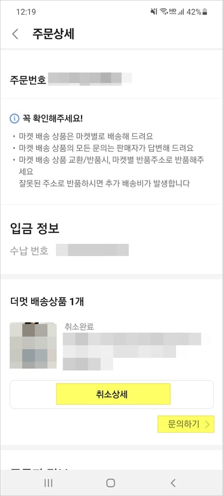 ▲그럼 주문 상세에서 문의하기와 취소했다면 취소 상세 내용 확인이 가능합니다.