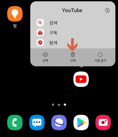 ▲홈 화면에서 유튜브 앱을 누르고 있으면 삭제 메뉴가 보입니다. 해당 삭제는 유튜브 앱 삭제가 아니고 홈 화면에서만 삭제를 하게 됩니다.
