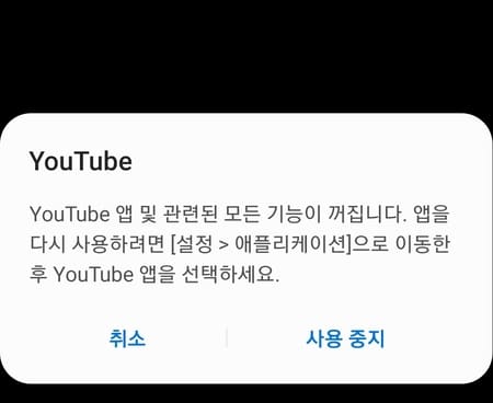 YouTube 어플을 사용중지하게 되면은 유튜브의 모든 기능이 꺼지게 되고 혹시나 나중에 유튜브 앱을 다시 이용하고자 한다면은 앱을 켜주시면 되겠습니다.