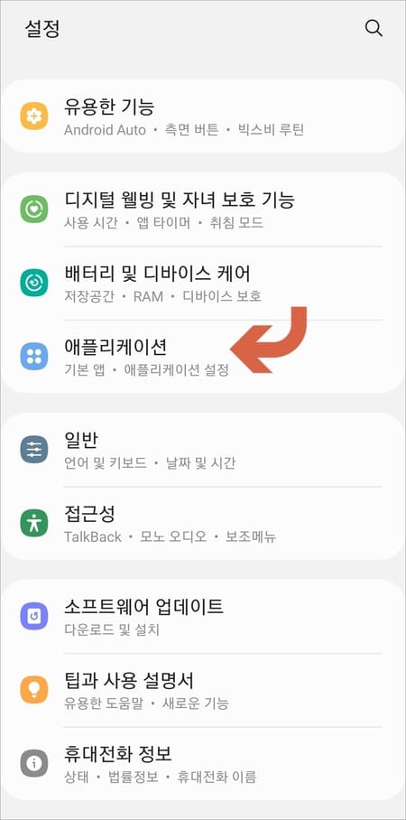 ▲설정에서 애플리케이션 메뉴에 들어가서 화면 오른쪽 상단에 검색 아이콘을 터치해줍니다.