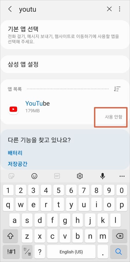 ▲검색에서 youtube를 검색해보면 유튜브 항목에 사용 안 함으로 표시되어 있습니다.