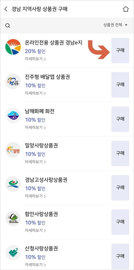 ▲경남 지역사랑 상품권을 선택하고 목록에서 온라인 전용 상품권 경남e지 구매 버튼을 터치합니다.