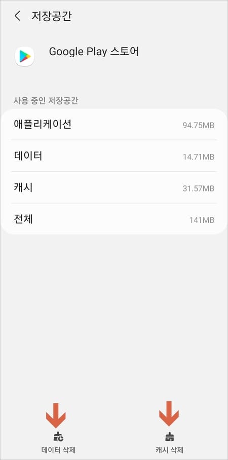 ▲애플리케이션 정보 화면에서 사용량> 저장공간에 들어갑니다. 화면 아래에 캐시 삭제 및 데이터 삭제를 해주고 업데이트가 되는지 확인해봅니다.