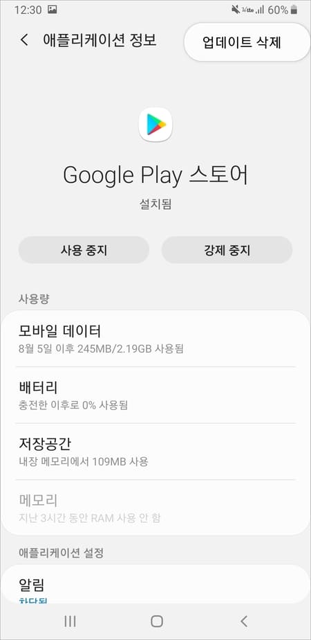 ▲구글 플레이 스토어 앱 아이콘을 누르고 있으면 새창이 뜨는데 느낌표 모양(앱 정보)을 터치합니다. 기기 소프트웨어 버전에 따라 화면이 다르게 보이는 경우도 있겠습니다.