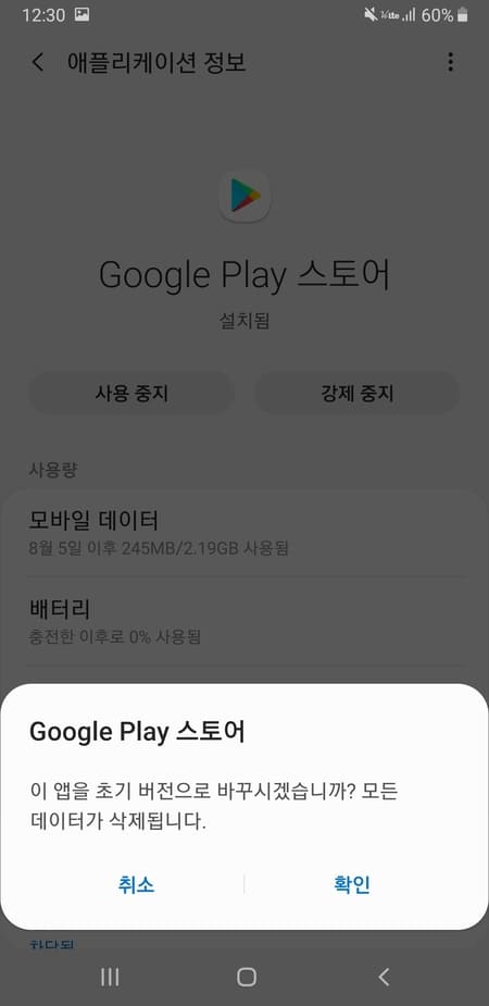 ▲업데이트 삭제 메뉴를 선택 후 앱을 초기 버전으로 바꿀 건지 묻는 창이 뜨면 확인을 터치합니다.