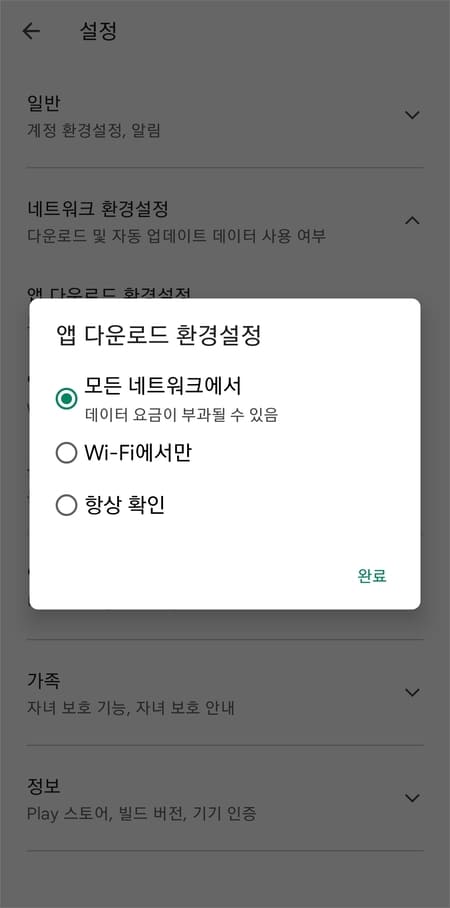 ▲자동 업데이트를 설정해두었는데 업데이트가 안 되는 경우는 핸드폰은 모바일 데이터에 연결해둔 상태이고 설정에서는 “Wi-Fi에서만”으로 설정을 해두게 되면 업데이트가 진행되지 않습니다. 핸드폰을 와이파이로 연결을 해주거나 모든 네트워크에서로 설정을 변경해주시면 됩니다. 앱 다운로드도 마찬가지로 설정 확인을 해보시면 되겠습니다.