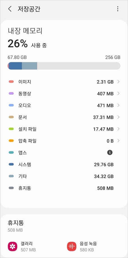 ▲혹시나 휴대폰의 저장공간이 꽉 차 있는 건 아닌지 확인해봅니다. 업데이트를 하게 되면 생각보다 많은 용량을 받게 되기 때문에 저장공간이 부족하게 되면 정상적으로 업데이트가 진행되지 않을 수 있습니다. 설정> 배터리 및 디바이스 케어> 저장공간에서 확인해본 후 용량이 부족하다면 갤러리 휴지통이나 불필요한 앱, 데이터들을 정리해서 용량을 확보해줍니다.