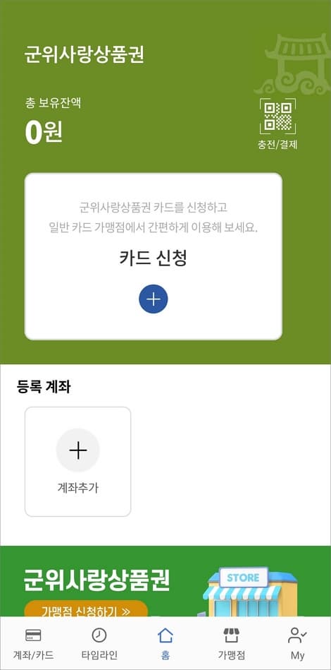 군위 지역화폐 앱을 통해서 편리하게 관리 사용해 볼 수 있습니다. 만 14세 이상이고 본인 명의로 된 은행 계좌가 있으면 신청이 가능하고 앱에 본인 은행 계좌 정보를 등록해서 충전을 해주시면 됩니다. 신청하면 보통 7일 내로 우편으로 배송되어 수령해 볼 수 있을 겁니다. 앱 이용하는 게 힘들다면은 근처 NH농협에 찾아가서 발급 신청 및 충전 등을 이용해 볼 수 있습니다.