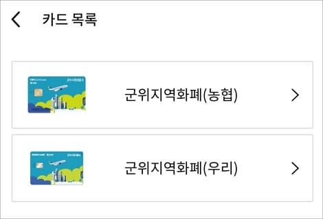 카드 신청에서는 농협이나 우리은행 중 하나를 선택해서 발급을 진행하시면 됩니다. 발급은 군위에 거주하지 않아도 가능하며 충전 잔액이 부족하거나 다른 지역에서 사용할 때에는 체크카드로 사용이 가능합니다. 이때 충전금에서 결제가 되지 않고 연결된 계좌에서 결제가 이루어집니다.