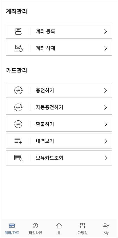 계좌/카드 메뉴에서는 계좌 등록 및 삭제, 충전하기(자동충전 포함), 환불, 이용내역 등의 메뉴를 이용해볼 수 있고 “My” 메뉴에서는 인증수단 관리(잠금 설정/생체 설정/비밀번호 재설정), 알림 설정, 체크카드 설정, 현금영수증 관리(소득공제), 해지/탈퇴 메뉴를 이용해볼 수 있습니다.