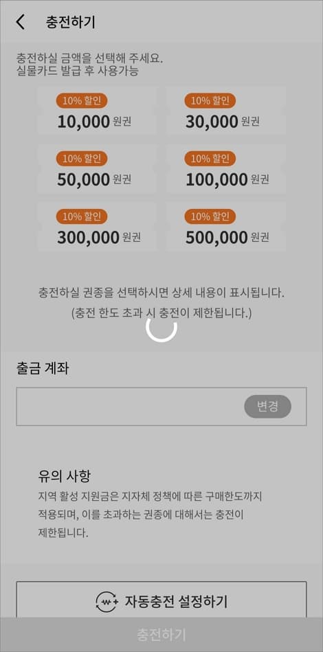 충전하기에서는 충전할 금액을 선택해서 진행하시면 됩니다.