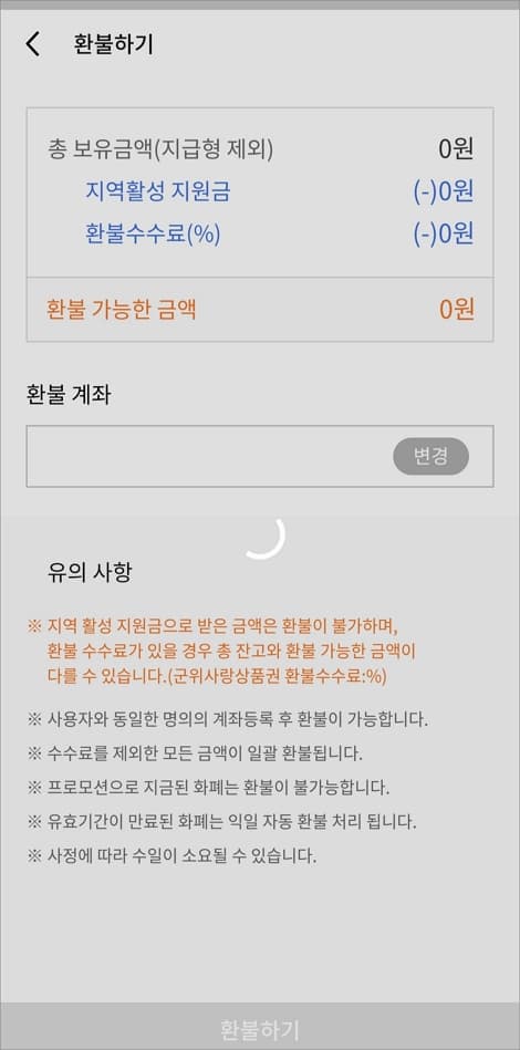 환불하기에서는 환불 가능한 금액을 확인 후 신청해주시면 됩니다. 충전한 금액을 환불하려면 앱 내에 환불 메뉴 이용이 가능하며 잔액에 대한 전액 환불만 진행이 되고 수수료가 발생하는데 1.5퍼센트입니다. 수수료를 빼고 환불은 등록된 계좌로 입금 처리가 되겠습니다. 입금 계좌는 사용자와 동일한 명의로 된 계좌만 가능합니다.