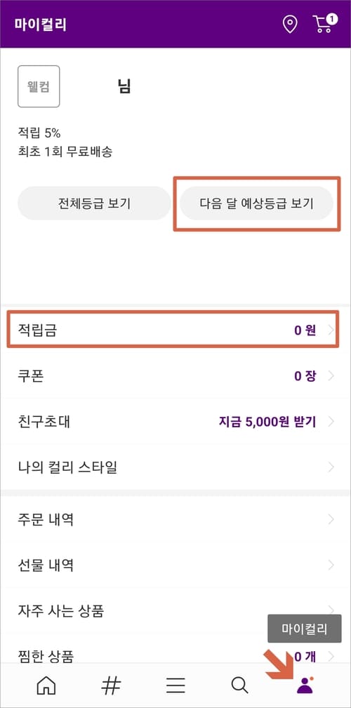 마켓컬리 등급 및 적립금 조회 확인 방법