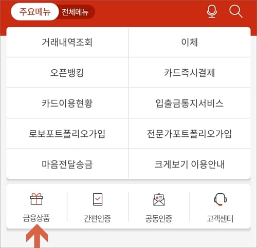 보통 가입 후 바로 상품을 골라서 가입할 수 있지만 좀 더 살펴보려면 홈 화면 우측 상단에 줄 3개 모양(≡) 아이콘을 누르고 금융상품 메뉴를 선택합니다.