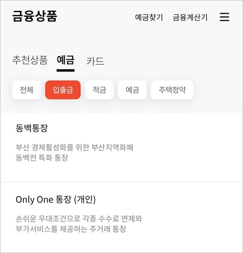 예금에서 입출금을 선택해서 개설할 계좌를 선택합니다.