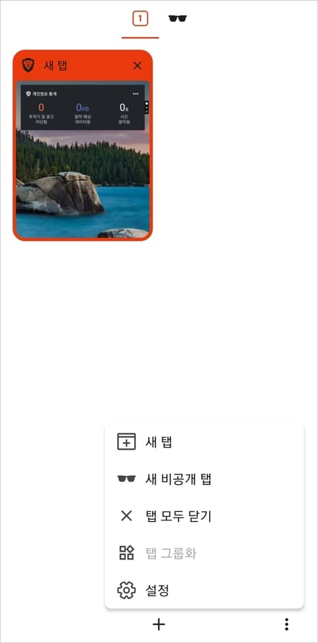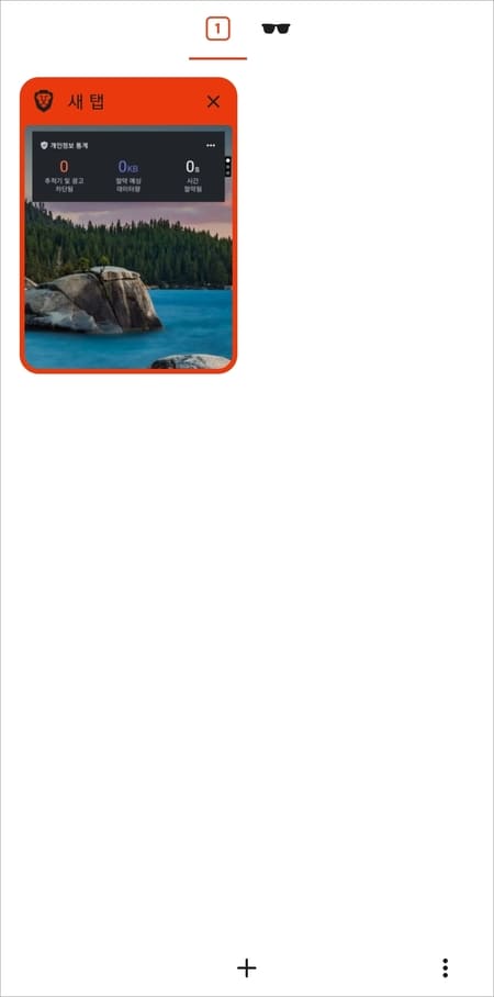 ▲화면 아래 탭 아이콘을 터치해보면 생성한 모든 탭이 소형 창으로 표시가 됩니다. 화면 아래 +를 터치해서 새 탭 추가를 해줄 수 있고 + 오른편에 있는 점 3개 아이콘을 터치해주면 새 탭, 새 비공개 탭, 탭 모두 닫기, 설정 메뉴를 이용할 수 있습니다.