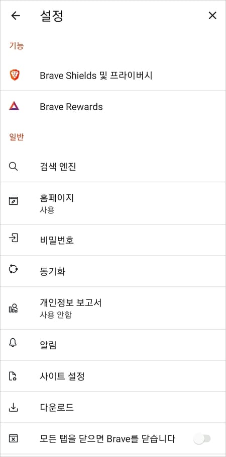 아마도 중점을 둔 부분이 사생활 보호랑 속도 부분인 거 같습니다. 브레이브 브라우저 앱 기능 항목 사생활 관련 침해 광고 차단/사생활 보호 탭 즐겨찾기 동기화/추적 방지 기능 내장형 애드블록/제삼자 쿠키 차단 보안용 HTTPS 에브리웨어/배터리 및 데이터 절약 기능