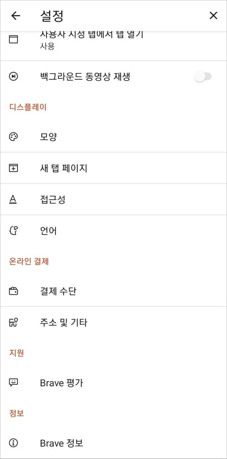 - 디스플레이 모양: 하단 툴바 사용 여부, 탭 그룹 활성화/비활성화, 공유 허브 비활성화/활성화