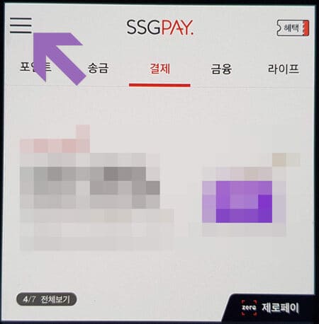 ▲SSGPAY 앱을 실행하고 왼쪽 상단에 가로선 3줄 모양을 터치합니다.