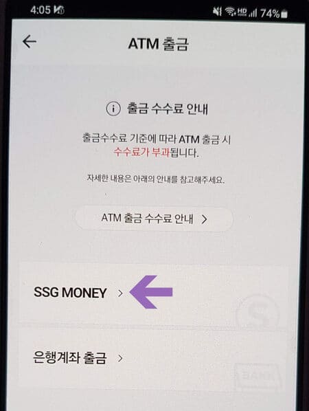 ▲라이프 항목에 ATM 출금 메뉴를 터치하고 다음 화면에서 SSG MONEY를 터치합니다.