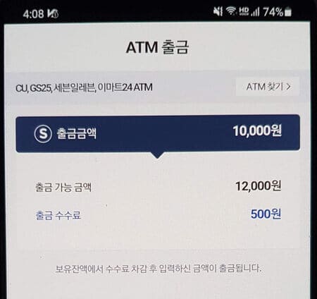 주변 편의점에 있는 atm 기기에서 출금이 가능한데요. 5천 원, 8천 원 이렇게 천 원 단위로는 출금이 불가능하고 1만 원 단위로 출금을 해줄 수 있습니다.