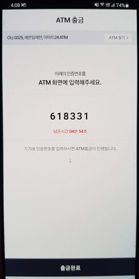 ▲생성된 인증번호 6자리를 atm 화면에 입력을 해주시면 출금 완료가 되겠습니다. 쓱머니를 만원 이상 보유하고 있는 상황에서 현금이 필요한 경우에 가까운 편의점에서 쉽게 출금을 해줄 수 있으니 이용 시 참고해보시길 바랍니다.