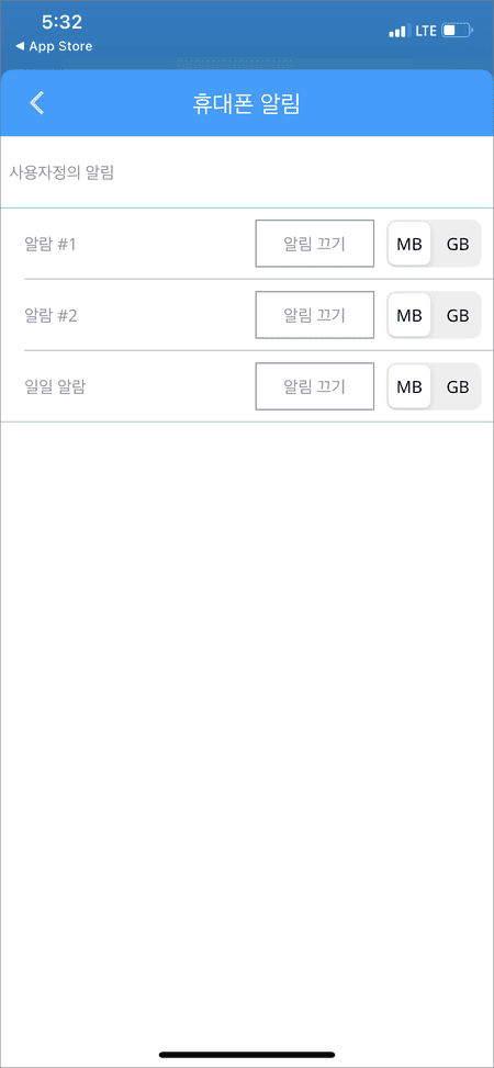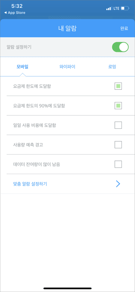 기본적으로 90% 도달함은 선택해주시면 되겠습니다. 맞춤 알림 설정하기에서는 사용자 정의 알림을 설정해줄 수 있습니다. 아이폰에서 데이터 사용량 확인하고 모니터링과 사용량을 제어하는데 이용해볼 수 있는 앱이니 참고해보시길 바랍니다.