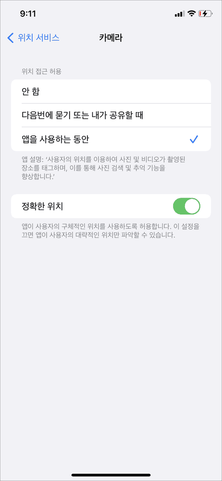 정확한 위치 기능을 비활성화해두면 대략적인 위치만 파악하게 됩니다. 사진을 자주 찍고 장소 구분을 하는 경우에 활용하면 도움이 되겠지만 아무래도 사진에 개인 위치정보가 상세하게 담겨 있다 보니 원하지 않는 경우도 있기 때문에 필요에 따라 설정해보시길 바랍니다.