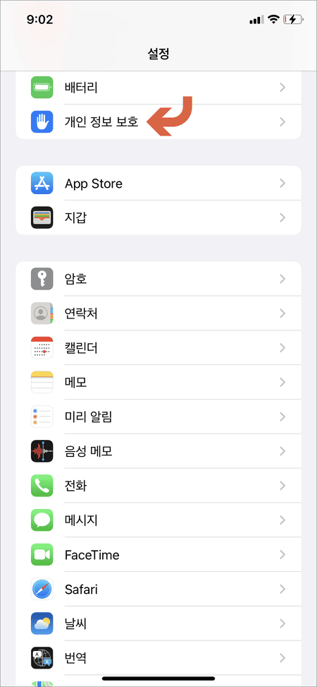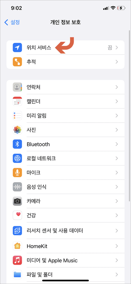 ▲설정에서 개인 정보 보호 메뉴에 들어갑니다. 개인 정보 보호 메뉴에서 위치 서비스에 들어갑니다.