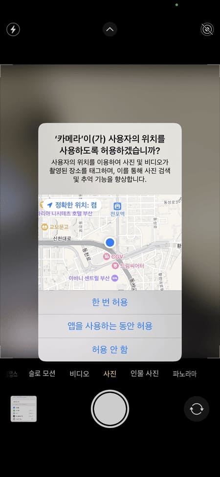 ▲위치 서비스 메뉴의 우측 버튼을 활성화시켜주고 아이폰 카메라 앱을 실행해봅니다. 그럼 카메라가 사용자의 위치를 사용할 수 있도록 허용할지 묻는 창이 뜹니다.