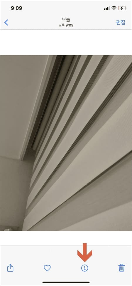 ▲아이폰으로 찍은 사진(위치 서비스 켠 상태로 찍은)을 사진 앱에서 선택 후 화면 아래 느낌표 모양의 아이콘을 터치합니다.