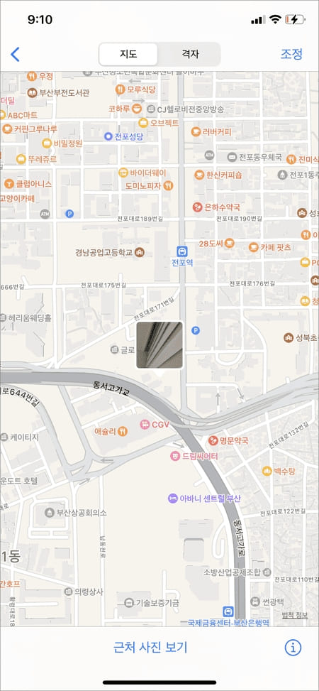 ▲화면 아래쪽을 보시면 사진을 찍은 위치정보가 지도에 표시가 되어있습니다. 해당 지도를 터치해봅니다. 그럼 더 상세한 위치를 지도로 확인이 가능합니다. 또 근처 사진 보기도 이용할 수 있습니다. 여러 장소에서 사진을 많이 찍는 경우에 장소 구분을 위해서 유용한 기능입니다.