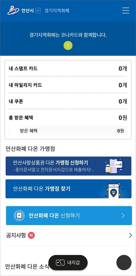 구글 플레이 스토어에서 경기지역화폐 앱을 설치해 주고 간략한 본인 정보 입력 후 핸드폰 문자 인증 등을 해주고 사용할 지역을 경기도 안산시로 선택을 해줍니다.