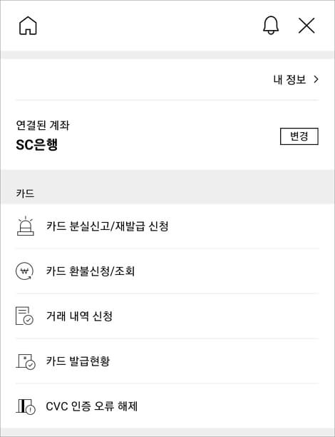 홈 화면 우측 상단에 ≡ 삼선 모양을 터치해서 들어가 보면 안산 다온카드 계좌 연결을 해줄 수 있고 환불 및 내역, 발급현황, CVC 인증 오류 해제 등의 메뉴도 이용해 볼 수 있습니다.