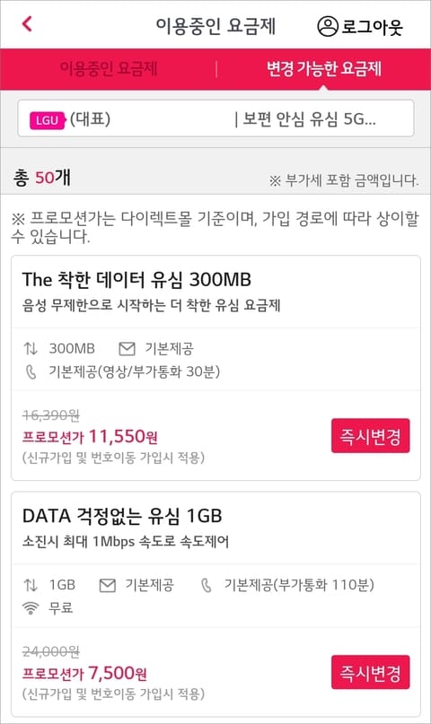 변경 가능한 요금제에서 목록을 전부 살펴보고 변경할 요금제 즉시 변경 버튼을 눌러줍니다.