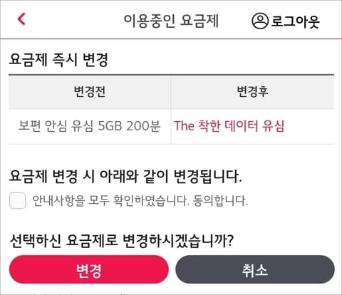 - 한 달에 한번 변경하고 나서 한 달 내에 다른 요금제로 다시 변경할 수 없습니다.