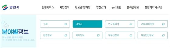 ▲시청 홈페이지 상단 메뉴를 보시면 민원서비스부터 시작해서 시민참여, 정보공개, 영천소개, 뉴스포털, 분야별 정보, 통합 예약시스템 메뉴가 있는데요. 여기서 분야별 정보에서 일자리 메뉴를 클릭해줍니다.