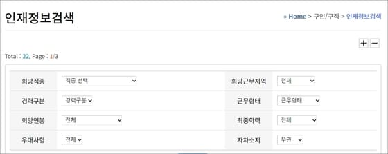 ▲인재검색에서도 직종이나 근무지역, 경력 등으로 검색을 통해서 인재를 검색해볼 수 있습니다.