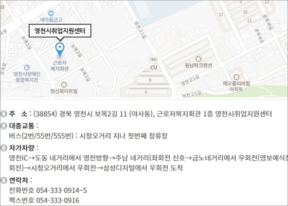 ▲지원센터 위치랑 연락처는 센터 홈페이지> 센터 소개> 찾아오는 길 메뉴에서 상세하게 내용 확인이 가능합니다. 주소지는 영천시 보목 2길 11에 복지회관 1층에 위치하고 있으며 대중교통이랑 자가 차량으로 찾아올 경우 해당 내용을 확인해보시면 되겠습니다.