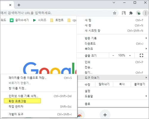 ▲크롬 브라우저를 실행하고 오른쪽 상단 점 3개 메뉴를 클릭해서 도구 더보기> 확장 프로그램을 클릭합니다.