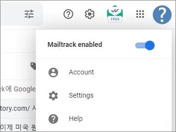 ▲지메일 오른쪽 상단에 보면 확장 프로그램 아이콘이 생성되어 있습니다. 클릭해보면 Mailtrack enabled 활성화/비활성화를 시켜줄 수 있고 Account, Settings, Help 등의 메뉴를 이용할 수 있습니다. 근데 사용할 일은 없더군요. 시간 나면 혹시 내게 필요한 기능이 있는지 둘러보든가 해보세요.