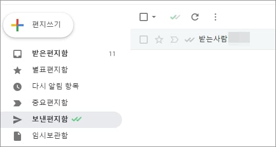▲메일 쓰기를 하고 보낸 편지함을 보시면 초록색 체크 모양이 표시되어 있습니다.
