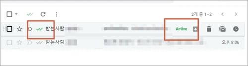▲초록색 체크 모양이 하나만 있으면 메일이 보내진 거고 초록색 체크가 두 개 다 표시되어있다면 상대방이 수신확인을 한 겁니다. 수신확인을 하면 받는 사람 옆에 녹색 체크가 2개 표시되고 Active가 표시됩니다.