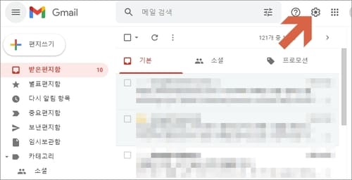▲지메일 화면 오른쪽 상단에 보면 톱니바퀴 모양의 아이콘이 있습니다.