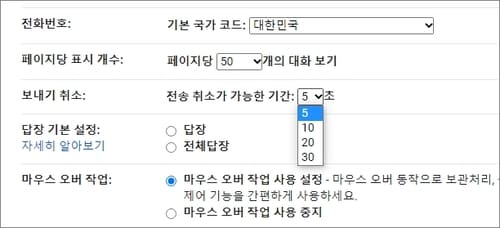 발송취소를 하기 위해서는 먼저 설정을 해줘야 합니다. 보내기 취소를 할 수 있는 시간도 최대 30초(5초/10초/20초)까지 설정이 가능하고 이후에는 취소를 해줄 수 있는 방법이 없는 거 같더군요.
